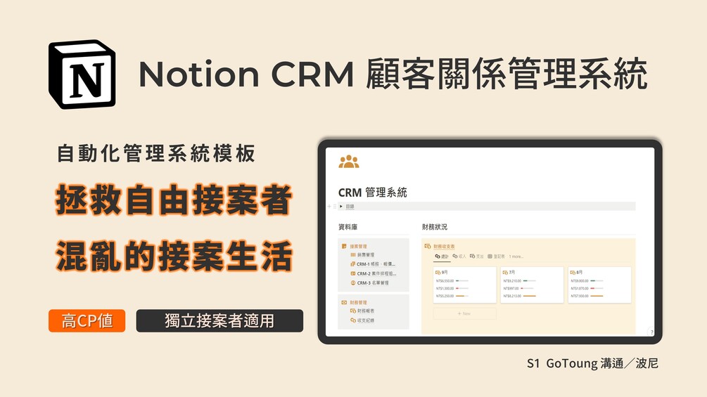 Noiton CRM 管理系統是一套自由接案者必備的顧客管理系統,不用付昂貴的金額買一個難以操作的複雜系統,只需用Notion就可以輕鬆好上手。