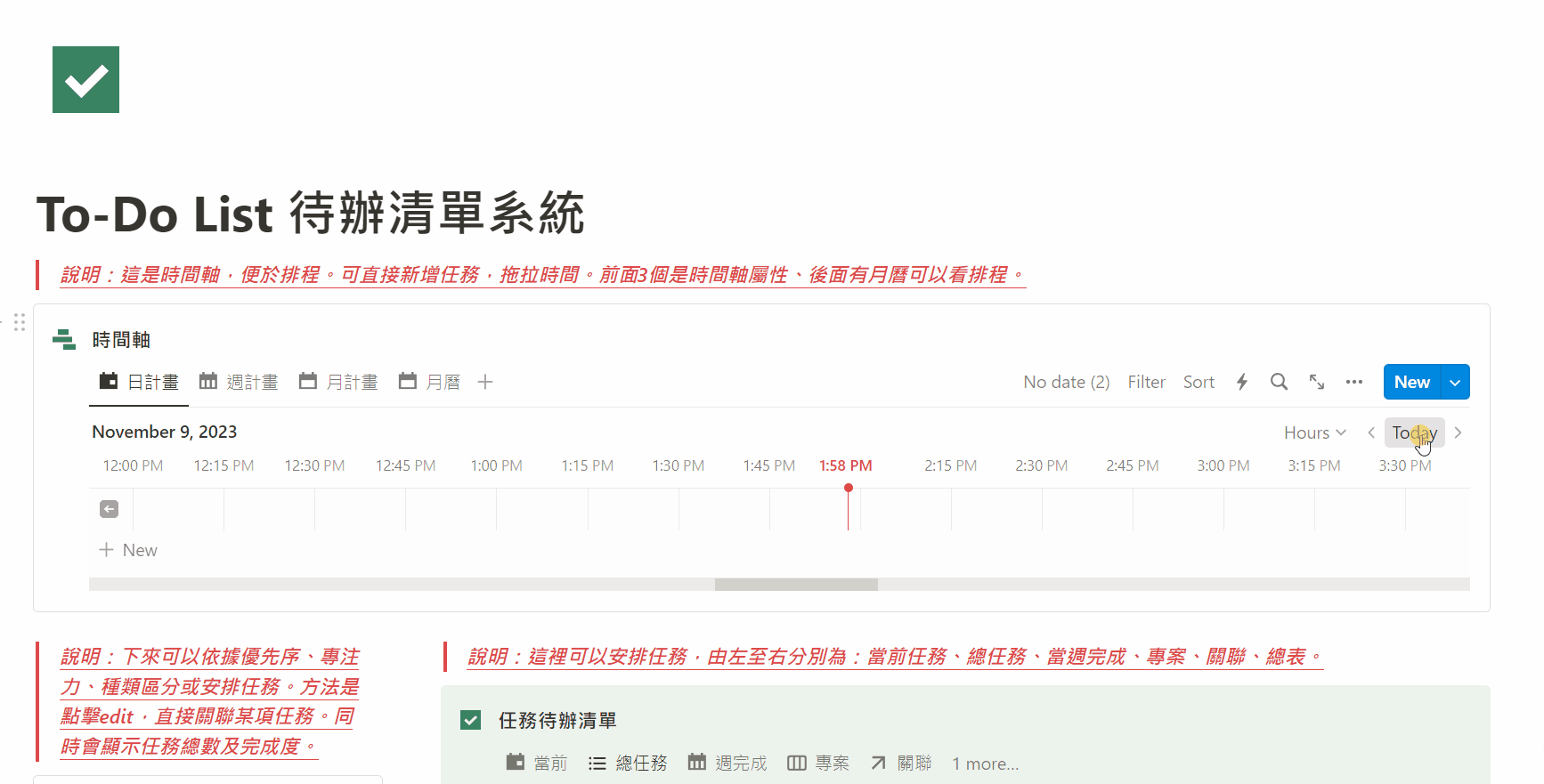 Notion To-Do List 是一套便於任務管理的待辦清單系統,擁有完整的架構、系統化的設計,絕對能滿足你對待辦清單的要求。